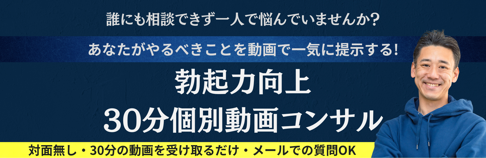 このサービスは、 事前アンケートをもとに、あなたの勃起力を向上させる具体的な対処法を、30分の動画にまとめて集中的に提案する個別動画コンサルです。 あなたの生活習慣や状態を把握したうえで、 具体的な改善策を次から次へと提示していきます。